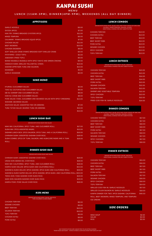 Welcome to Kanpai Sushi Dublin, a gem nestled in the heart of Dublin, CA. This beloved local eatery invites you to savor an extensive menu that caters to all sushi enthusiasts and those craving hearty Japanese dishes. From the tantalizing Chicken Teriyaki to the crispy Pork Katsu, each dish boasts quality and flavor that leaves diners delighted.